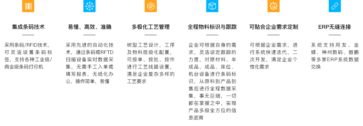 6. 实时、高效、准确地跟踪产品,在每道工序及每个质检环节的全过程,使企业具备更完善、更有竞争力的生产过程和品质管理能力。